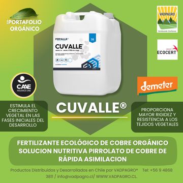 CUVALLE Fertilizante basado en cobre con una elevada eficacia de absorción foliar y radicular, gracias a la presencia de moléculas orgánicas. El cobre actúa como un estimulador del crecimiento, incrementando el metabolismo de las proteínas implicadas en las fases iniciales del desarrollo de la planta. Producto cero residuos.