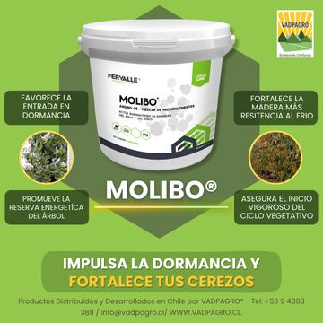MOLIBO es un producto con alta concentración de Boro (11% p/p) y Molibdeno (11% p/p). En cerezos el Mo, favorece control de vigor y entrada en dormancia. Su objetivo es la translocación de azúcares para formar reservas en predormancia, además lignifica madera y yemas para afrontar de mejor forma las posibles heladas..