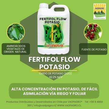 FERTIFOL FLOW POTASIO Es un Fertilizante líquido de alta concentración en potasio, de fácil asimilación, con aminoácidos vegetales de origen totalmente natural y con pH neutro.